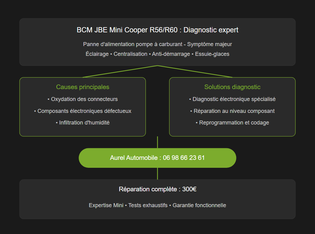 Votre Mini Cooper ne démarre plus ou cale de façon imprévisible ? La panne d’alimentation de la pompe à carburant est le symptôme principal d’un BCM JBE défaillant sur les Mini R56 et R60. Cette défaillance critique, ainsi que d’autres problèmes électriques comme les dysfonctionnements d’éclairage ou de verrouillage centralisé, peuvent transformer votre plaisir de conduite en véritable cauchemar. Ces symptômes pointent souvent vers une défaillance du BCM JBE, ce module électronique crucial qui orchestre de nombreuses fonctions de votre véhicule. Par conséquent, sa défaillance peut paralyser plusieurs systèmes simultanément. Heureusement, des solutions existent pour restaurer le bon fonctionnement de votre Mini. Aurel Automobile, spécialiste en réparation électronique automobile, vous accompagne dans cette démarche technique avec un diagnostic expert. Contactez-nous au 06 98 66 23 61.
