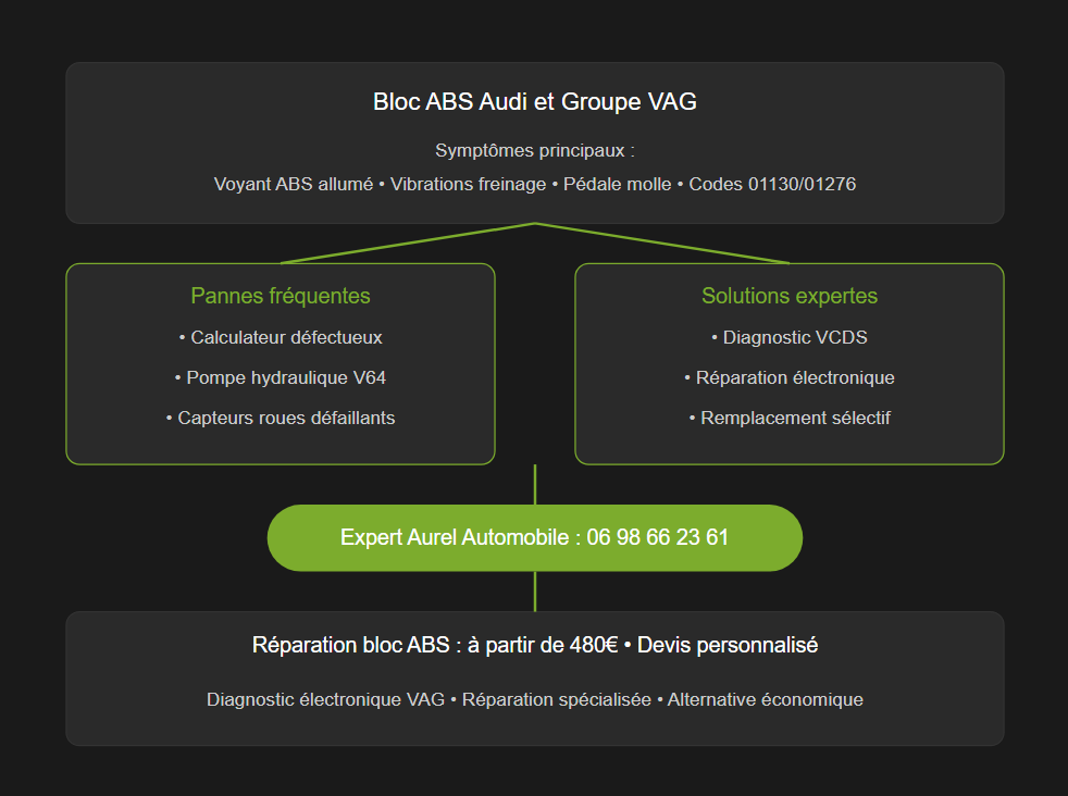 Le bloc ABS chez Audi et le groupe VAG en général représente-t-il vraiment un casse-tête pour les automobilistes ? La réponse est malheureusement oui ! En effet, ce système antiblocage sophistiqué peut parfois présenter des défaillances spécifiques aux véhicules Volkswagen, Seat et Skoda. Votre voyant ABS s’allume-t-il sans cesse ? Ressentez-vous des vibrations anormales au freinage ? Des codes erreur comme 01130 ou 01276 apparaissent-ils lors du diagnostic ? Rassurez-vous, ces problèmes ont des solutions concrètes. Besoin d’un diagnostic professionnel ? Contactez-nous au 06 98 66 23 61.