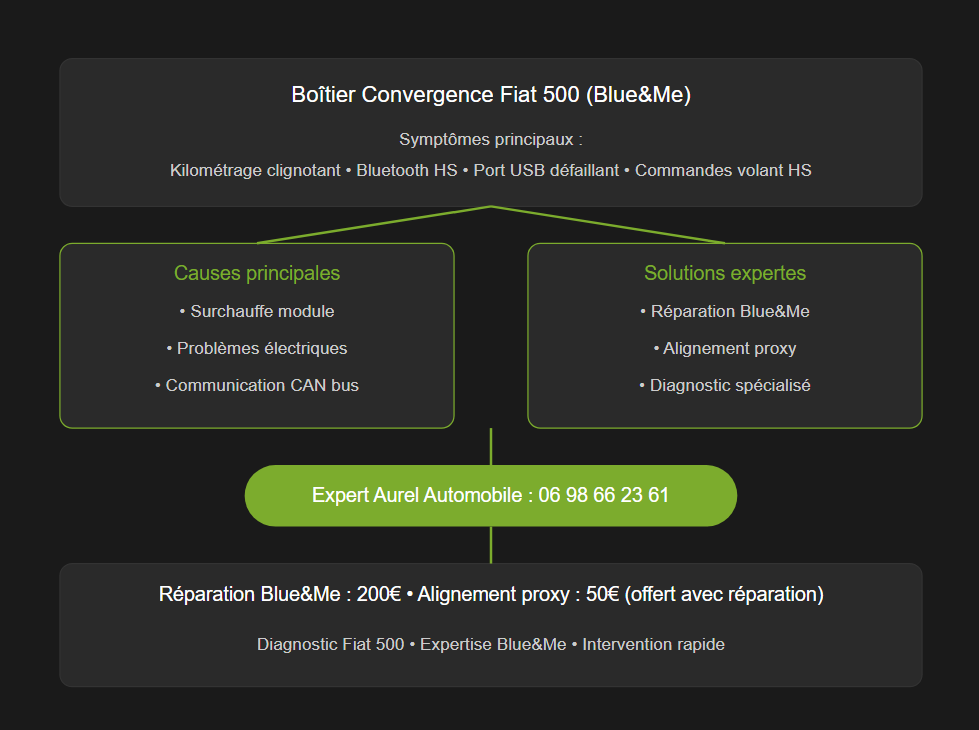 Votre Fiat 500 présente-t-elle des dysfonctionnements étranges ? Le boîtier convergence Fiat 500 défaillant est-il la cause de vos problèmes ? En effet, ce module électronique central, également appelé Blue&Me, peut provoquer de nombreux symptômes gênants. Vous remarquez peut-être que le kilométrage clignote sur votre tableau de bord ? Votre Bluetooth Fiat 500 ne fonctionne plus correctement ? Le port USB Fiat 500 présente des problèmes de connexion ? Ces signes pointent vers un boîtier de convergence défectueux. Des symptômes suspects sur votre Fiat 500 ? Appelez-nous au 06 98 66 23 61 pour un diagnostic professionnel.