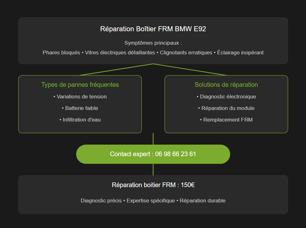 Votre BMW E92 montre des signes étranges ? Les phares s’allument tout seul ? Les vitres électriques ne répondent plus ? Le boîtier FRM BMW E92 est probablement en cause. Ce module électronique crucial gère de nombreuses fonctions essentielles de votre véhicule. Dans ce guide complet, découvrez comment identifier, comprendre et résoudre ces problèmes efficacement. Besoin d’un diagnostic rapide ? Appelez-noud au 06 98 66 23.