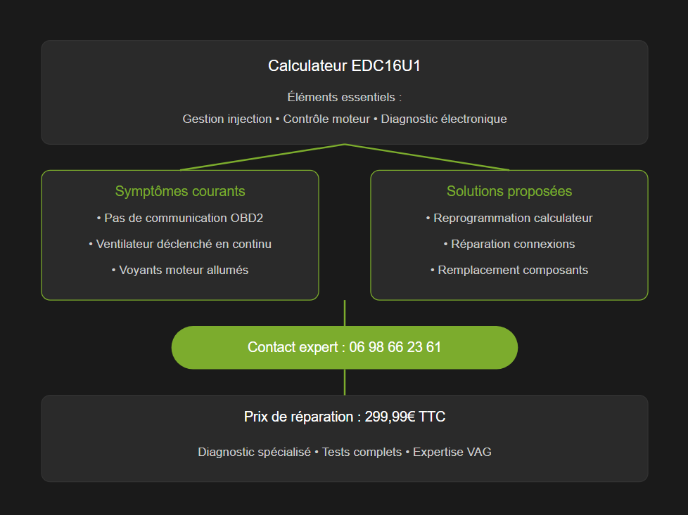 Des problèmes avec votre calculateur EDC16U1 ? Le ventilateur se déclenche sans raison ? La communication OBD2 est impossible ? À première vue, ces pannes semblent complexes. En effet, ce boîtier électronique gère tout le système d’injection de votre moteur TDI. Pourtant, des solutions existent ! Un diagnostic précis s’impose ? Contactez-nous au 06 98 66 23 61 pour une intervention rapide.
