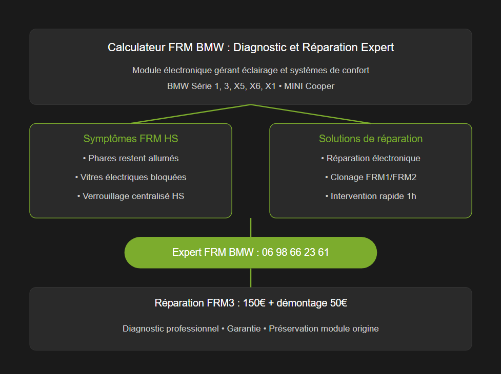 Vos phares restent-ils allumés même après avoir coupé le contact ? Quelle est la différence entre réparation et remplacement de FRM ? Vos vitres électriques ne répondent-elles plus ? Ces dysfonctionnements frustrants sont souvent liés au calculateur FRM de votre véhicule. Le calculateur FRM (Footwell Module) constitue le cerveau électronique qui gère de nombreux systèmes de confort et de sécurité dans les véhicules BMW et MINI. Lorsqu’il tombe en panne, les conséquences peuvent être multiples et gênantes au quotidien. Heureusement, Aurel Automobile dispose de l’expertise technique nécessaire pour diagnostiquer et réparer efficacement votre calculateur FRM défaillant. Contactez-nous au 06 98 66 23 61 pour un diagnostic professionnel de votre calculateur FRM.