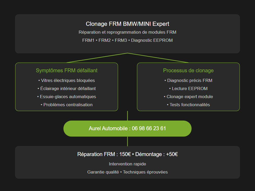 Votre BMW ou MINI présente-t-elle des dysfonctionnements étranges ? Vitres électriques bloquées, éclairage intérieur défaillant ou essuie-glaces automatiques en panne ? Ces symptômes révèlent souvent un problème de clonage de FRM, le module électronique central de votre véhicule. Le FRM (Footwell Module) contrôle de nombreuses fonctions électriques essentielles. Lorsqu’il tombe en panne, seul un clonage professionnel peut restaurer les fonctionnalités de votre véhicule. Chez Aurel Automobile, nos experts maîtrisent parfaitement les techniques de clonage FRM pour tous les modèles BMW et MINI. Notre savoir-faire technique garantit une intervention rapide et fiable. Découvrez comment nous pouvons résoudre vos problèmes électriques automobiles efficacement. Contactez-nous au 06 98 66 23 61 pour un diagnostic FRM professionnel !