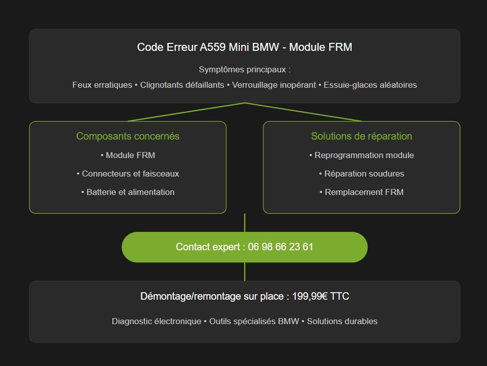 Le code défaut A559 indique un souci électrique sur votre Mini BMW. Plus précisément, il concerne une panne du boîtier FRM (Footwell Module). Ce module électronique pilote plusieurs fonctions essentielles du véhicule, notamment :