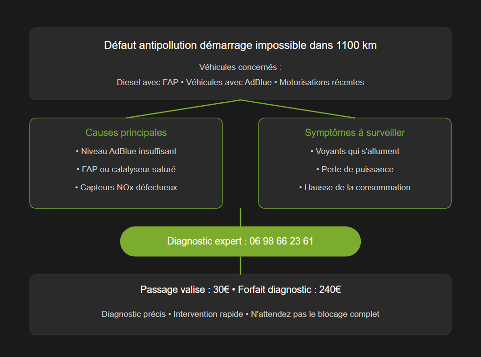 1. Pourquoi mon véhicule m’affiche-t-il « défaut antipollution – démarrage impossible dans 1100 km » ?
