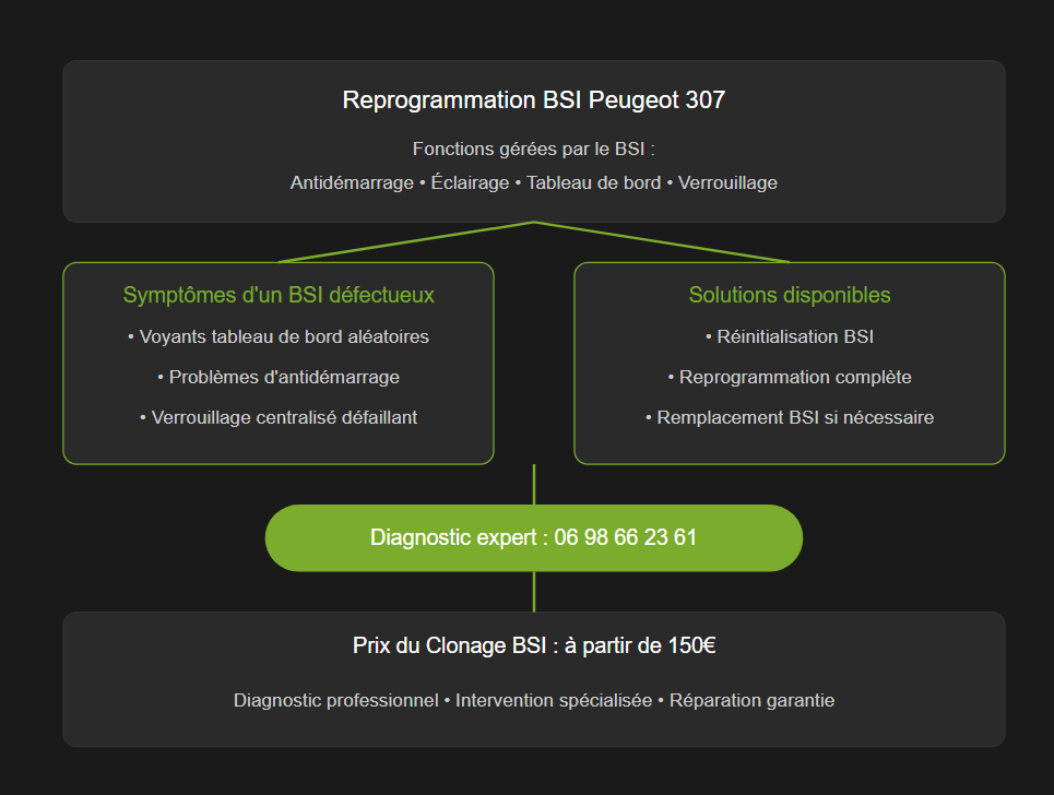 Vous rencontrez des problèmes électroniques sur votre Peugeot 307 ? La reprogrammation BSI 307 pourrait être la solution. Des voyants qui s’allument sans raison ? Des problèmes d’antidémarrage ? Une électronique capricieuse ? Découvrez dans ce guide complet toutes les réponses à vos questions sur le BSI de votre Peugeot 307. Besoin d’un diagnostic rapide ? Nos experts sont à votre écoute. Contactez-nous au 06 98 66 23 61 !