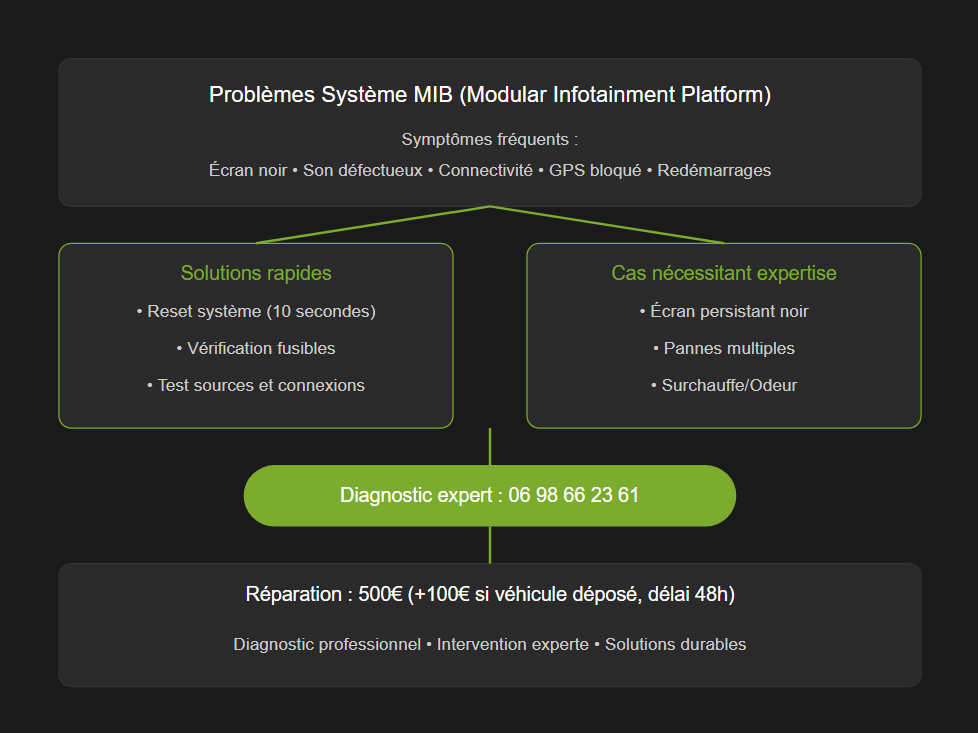 Votre système MIB vous cause des soucis ? L’écran reste désespérément noir ? Le son ne fonctionne plus ? Ces situations sont particulièrement stressantes. À première vue, un problème système MIB peut sembler insurmontable. Le MIB (Modular Infotainment Platform) gère toutes les fonctions multimédia de votre véhicule. Son bon fonctionnement est donc essentiel. Fort heureusement, de nombreuses solutions existent. Ce guide vous accompagne pas à pas vers la résolution de votre panne. Nous commencerons par les solutions les plus simples. Besoin d’un diagnostic rapide pour votre problème système MIB ? Contactez-nous au 06 98 66 23 61 !
