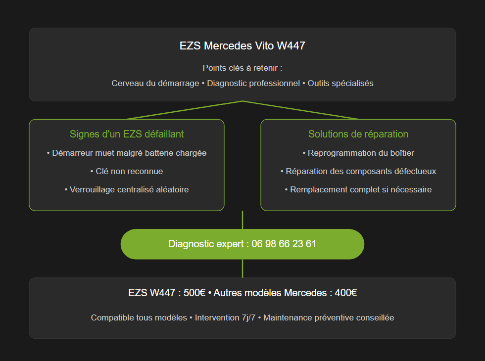 Votre EZS de Mercedes Vito W447 vous pose problème ? Impossible de démarrer votre véhicule ? La clé n’est plus reconnue ? Vous n’êtes pas seul dans cette situation. Les problèmes d’EZS touchent de nombreux propriétaires de Mercedes Vito W447. À vrai dire, l’EZS (Elektronisches Zündschloss) est le cerveau électronique qui gère le démarrage de votre utilitaire. Son bon fonctionnement est crucial. Besoin d’un diagnostic rapide ? Nos experts sont disponibles 7j/7 au 06 98 66 23 61 !