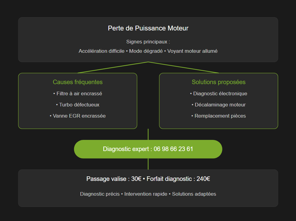 Votre voiture montre des signes de perte de puissance ? Vous n’êtes pas seul dans cette situation. En fait, la perte de puissance moteur touche de nombreux conducteurs. Cette baisse soudaine des performances peut survenir de différentes manières. Parfois, elle se manifeste par des difficultés à accélérer. D’autres fois, votre véhicule peine dans les côtes. Dans tous les cas, ce problème nécessite une attention particulière. Besoin d’un diagnostic rapide ? Nos experts sont disponibles au 06 98 66 23 61 pour évaluer votre situation.