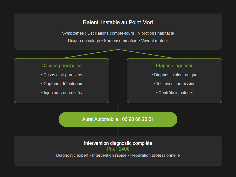 Un ralenti instable peut provenir de capteurs défectueux, d’injecteurs encrassés ou d’une prise d’air parasite. La cause exacte nécessite un diagnostic professionnel.