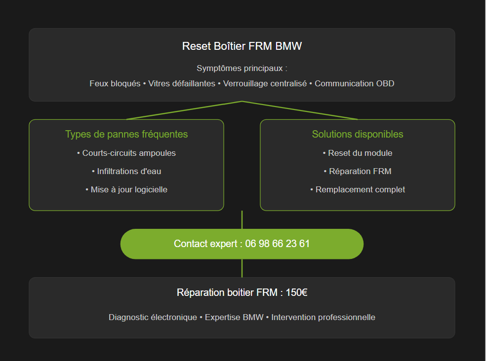 Vous cherchez des informations sur le reset boitier FRM BMW ? Vos feux restent mystérieusement allumés ? Les vitres électriques ne répondent plus ? Le boîtier FRM est probablement en cause. À première vue, un reset du boitier FRM BMW semble être la solution idéale. Mais est-ce vraiment le cas ? La réponse n’est pas si simple. En effet, le reset FRM représente une solution parmi d’autres. Dans cet article, nous allons examiner en détail quand cette approche est pertinente, et surtout, quand elle ne l’est pas. Besoin d’un diagnostic rapide ? Contactez-nous au 06 98 66 23 61