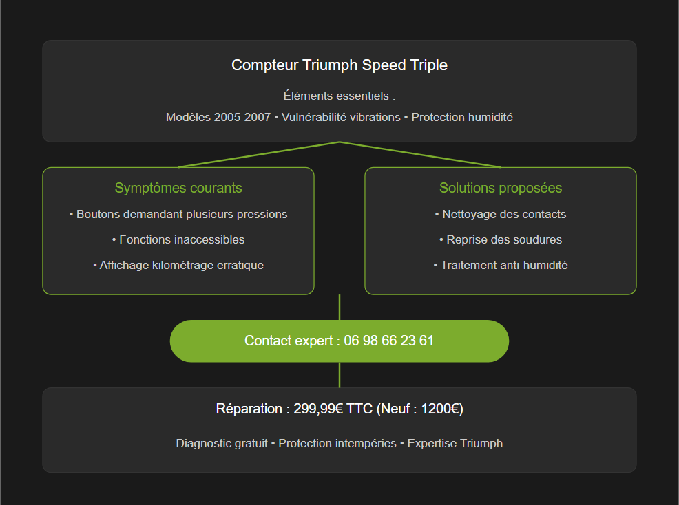 Votre compteur Triumph Speed Triple vous joue des tours ? La réparation du compteur Triumph Speed Triple est une préoccupation fréquente. Les boutons ne répondent plus ? L’affichage devient capricieux ? Pas de panique ! Les problèmes de compteur touchent particulièrement les Speed Triple des années 2005 à 2007. La position de conduite et le châssis restent parfaits. Mais le tableau de bord montre des signes de faiblesse. Un diagnostic professionnel permet souvent d’éviter le remplacement complet. Notre expertise en électronique moto vous aide à retrouver toutes les fonctionnalités. Besoin d’un diagnostic précis ? Contactez nos experts au 06 98 66 23 61 pour une évaluation gratuite de votre compteur.