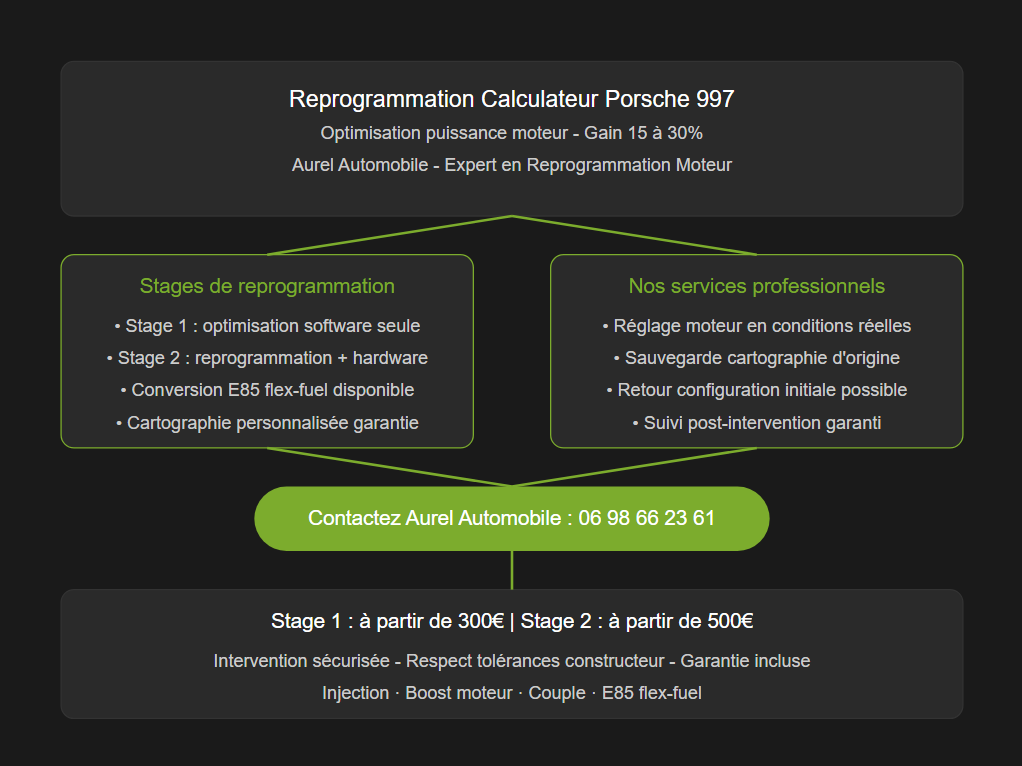 Vous ressentez que votre Porsche 997 pourrait offrir davantage ? La reprogrammation du calculateur moteur d’une Porsche 997 représente la solution idéale pour libérer le potentiel caché de votre sportive allemande. Cette technique d’optimisation de la puissance moteur permet d’augmenter significativement les performances tout en respectant la fiabilité moteur. Nos professionnels en reprogrammation vous accompagnent dans cette démarche technique avec expertise et garantie. Pour découvrir les possibilités d’optimisation de votre Porsche 997, contactez Aurel Automobile au 06 98 66 23 61.