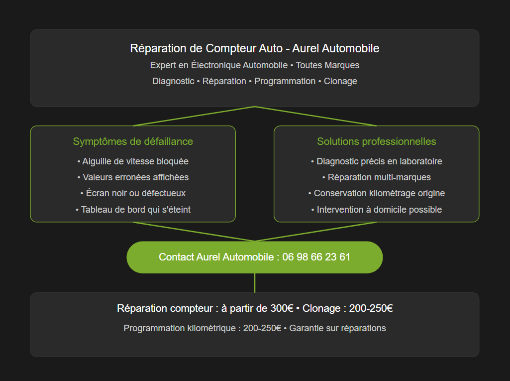 Votre compteur de voiture affiche des valeurs erronées ? L’aiguille de vitesse reste bloquée ou votre tableau de bord s’éteint sans raison ? Ces symptômes de pannes nécessitent une intervention rapide d’un expert en réparation de compteur auto. Aurel Automobile, spécialisé dans l’électronique automobile, vous propose des solutions de réparation efficaces et garanties pour votre compteur automobile, évitant ainsi le coût prohibitif d’un remplacement. Contactez-nous au 06 98 66 23 61 pour un diagnostic immédiat.